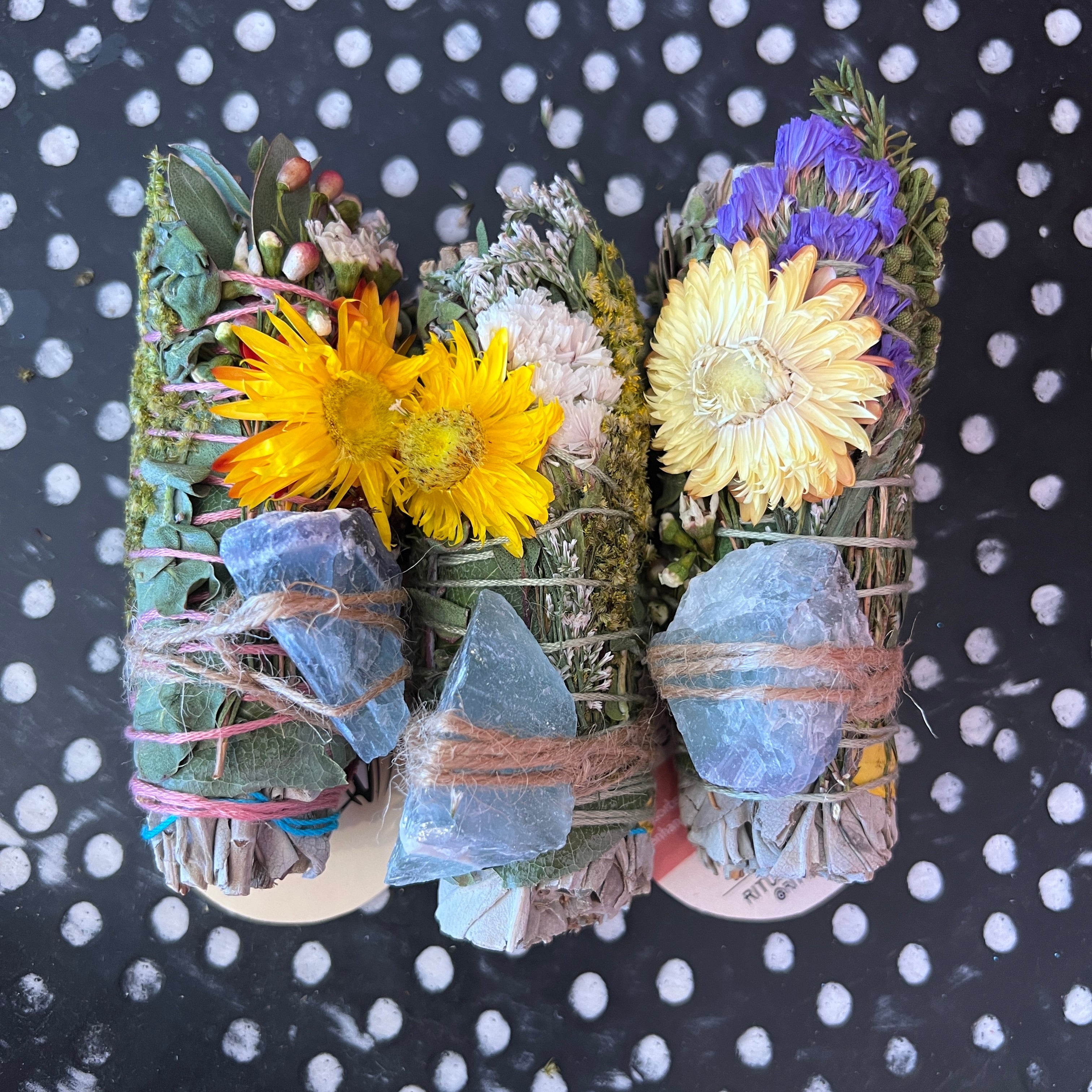 Get ready to cleanse your home or workspace with our handmade Smudging Sage Wand featuring a beautiful calming Fluorite crystal, wildflowers, rose petals, and eucalyptus. Burning this wand will not only rid the air of bacteria and pollutants but also eliminate negative energy and bad vibes. Let the purification begin!