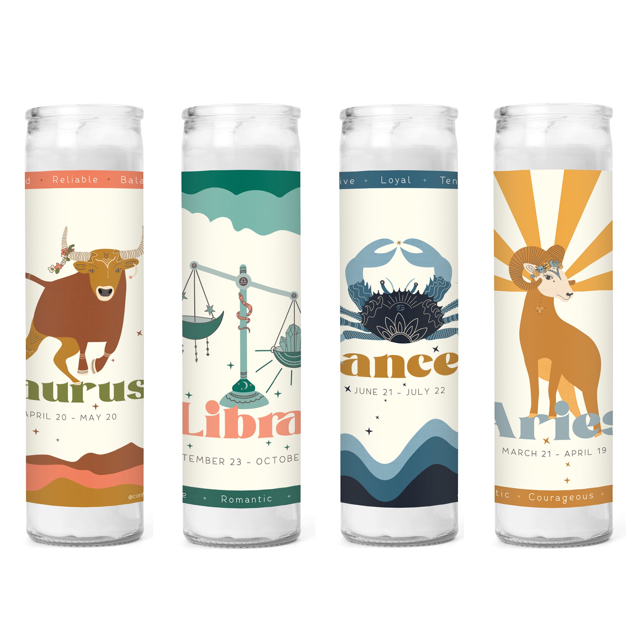 Experience the true essence of communicative Libra: genuine, amorous, and just. Our top-notch custom-made Libra prayer candles, designed exclusively for Confia Collective by Ali Taylor, are the ultimate gift. Each candle showcases the sign's symbol, constellation, and elemental traits, radiating light and magnifying your zodiac's power.