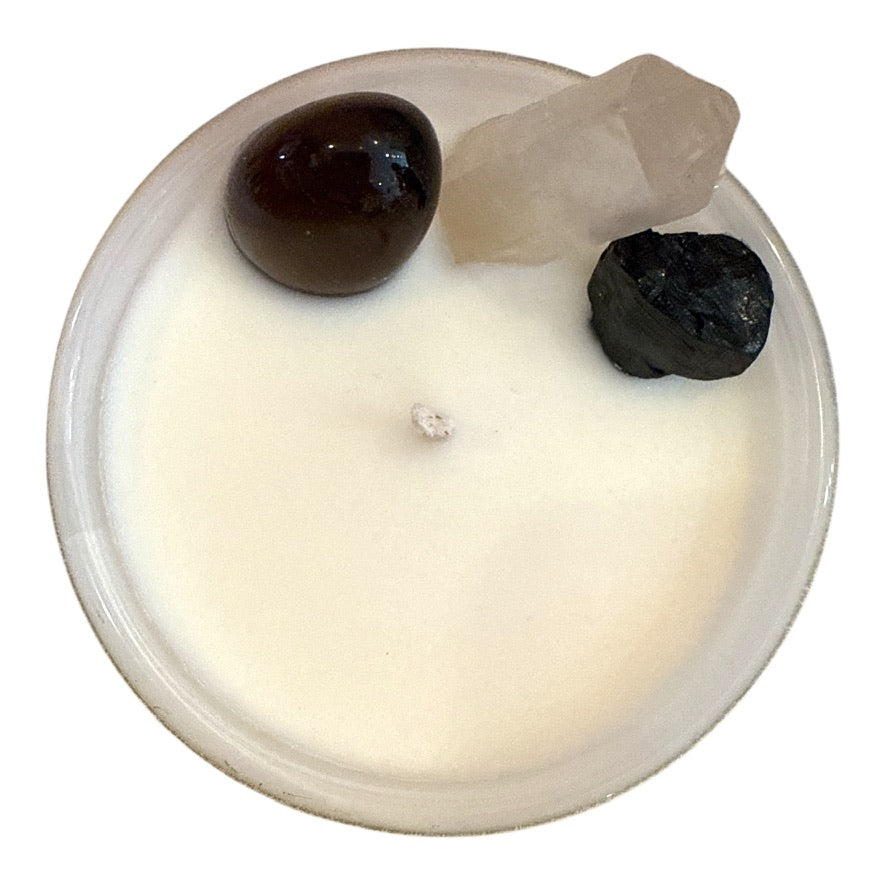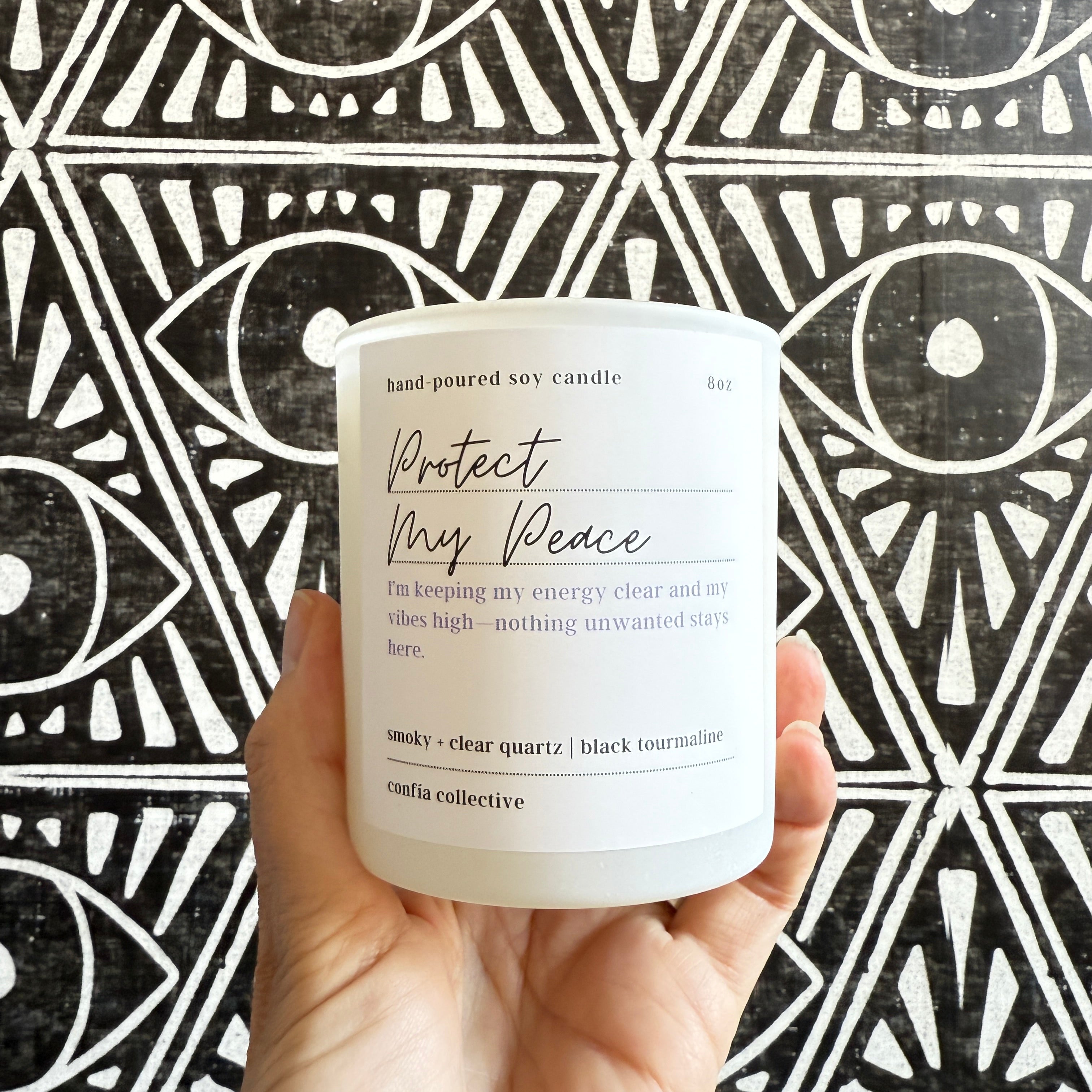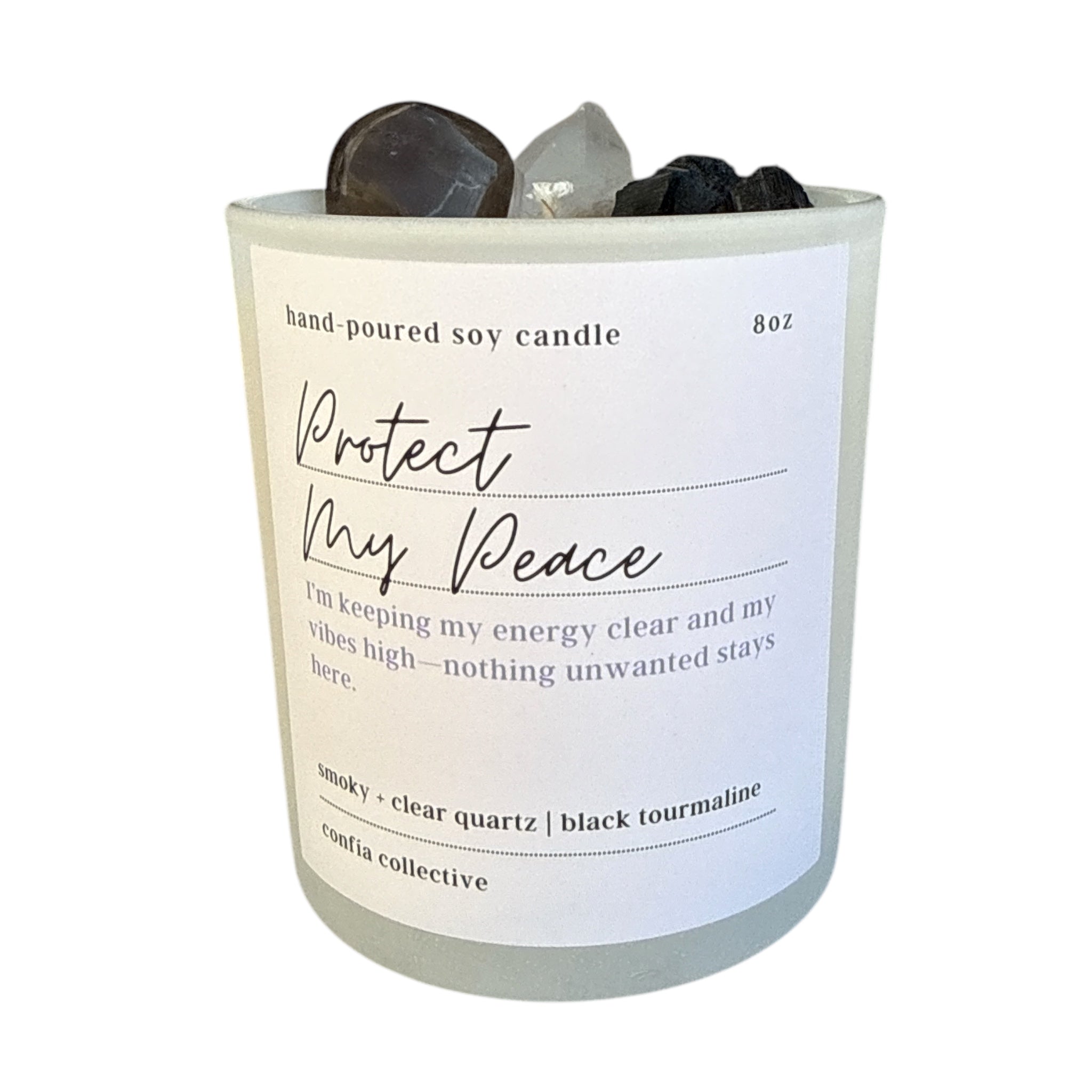Let us present the one-of-a-kind Protect My Peace Confía Crystal Candle, with lavender sage essence. This delightful candle is crafted from all-natural soy wax and contains three authentic crystals: Smoky Quartz, Clear Quartz, and Black Tourmaline. These crystals help keep you safe, anchored, and surrounded by good vibes, making this candle a must-have for those wanting a calm and harmonious atmosphere in any space. Protect not just your surroundings, but also your energy and tranquility!