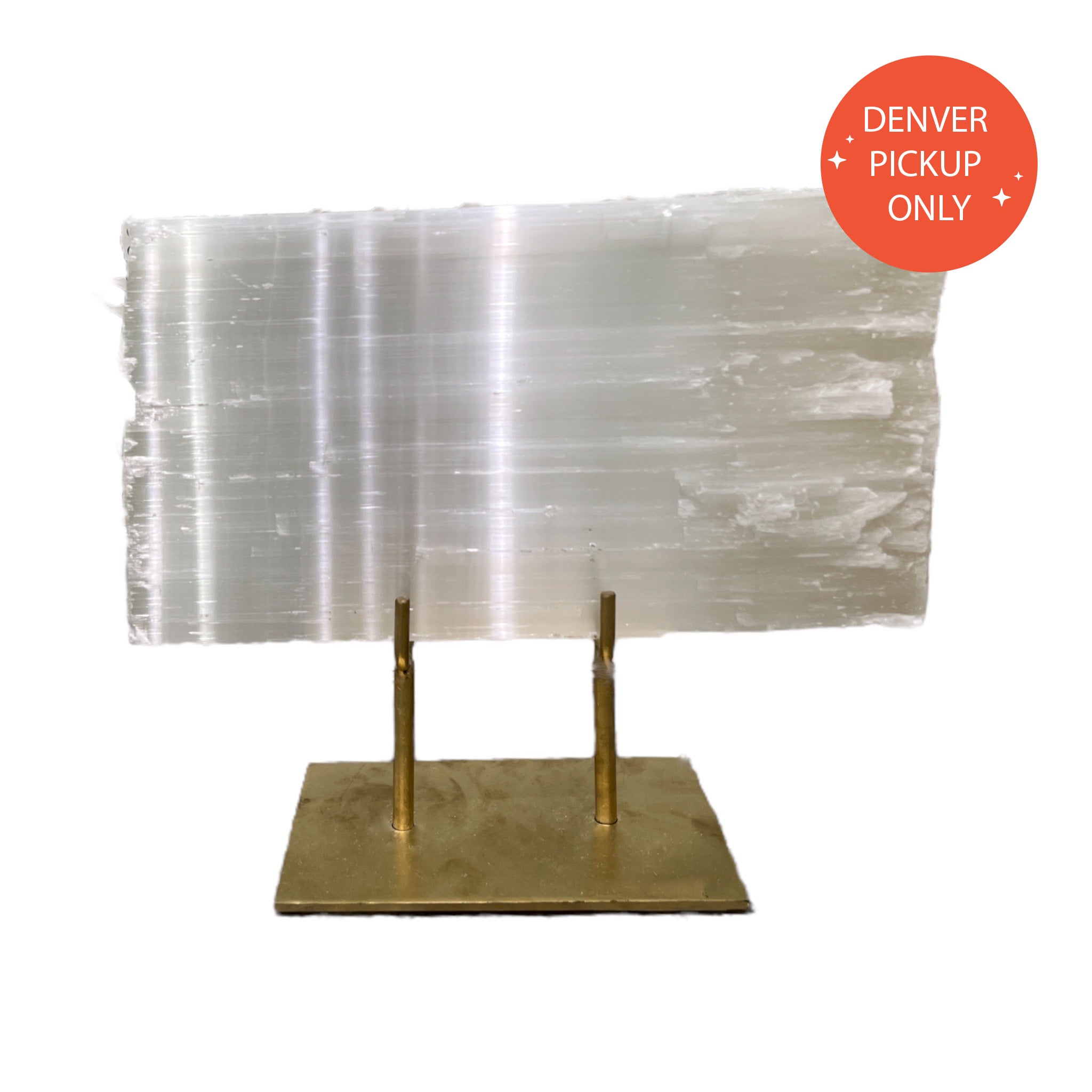 Flaunt your selenite! This impressive stone comes perched high atop a gleaming gold stand—perfect for clearing the air and illuminating your living space. Get ready to wow your guests with this large selenite slab on a chic golden stand.