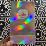 Hand holding a magical mystery iridescent bag against a black and white geometric patterned background