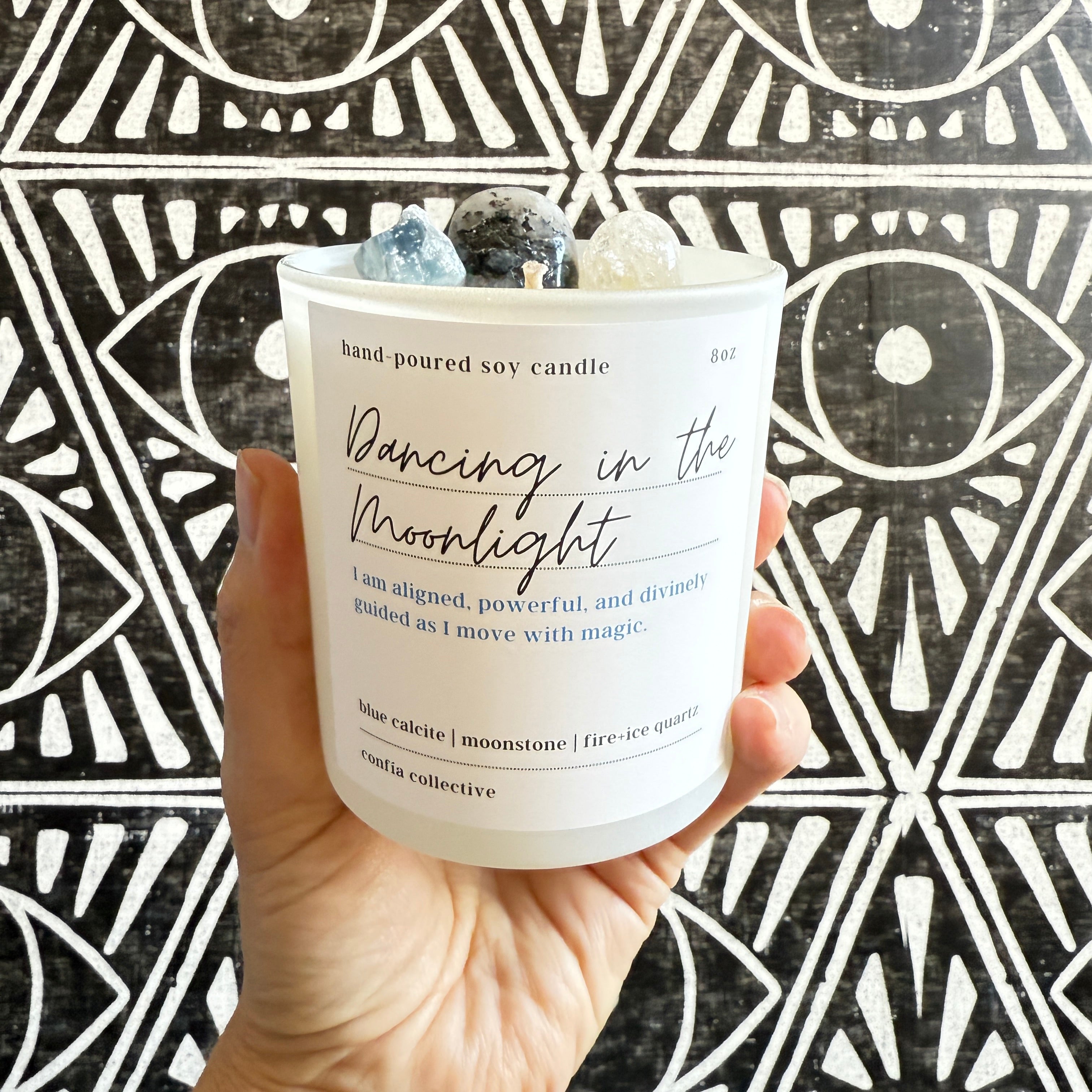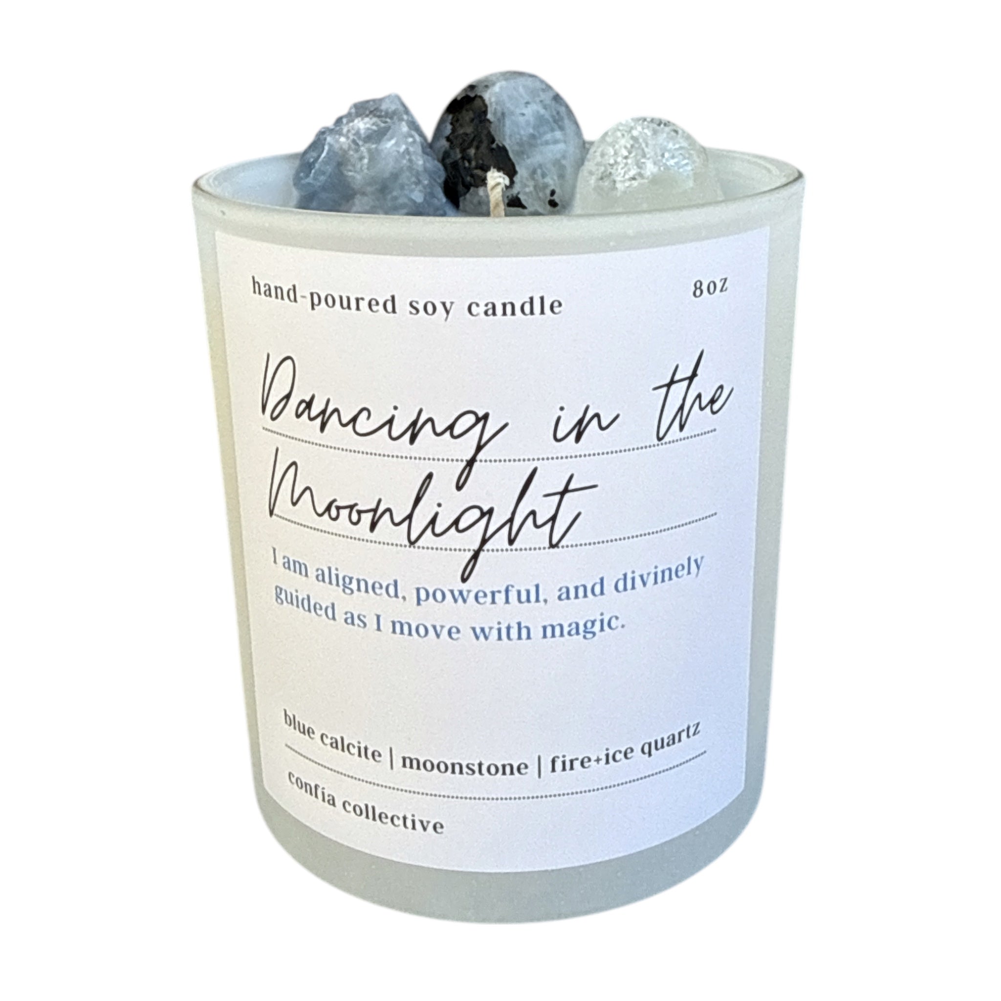Introducing our mystical and enchanting Dancing in the Moonlight Crystal Candle. This exquisite 8 oz. candle is made from high-quality 100% soy wax and infused with the sweet scent of vanilla sugar. Amp up your moon cycle rituals, light this candle and howl at the moon!
