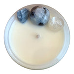 This stunning candle contain three gorgeous crystals, including blue calcite, moonstone, and fire & ice quartz, each renowned for their unique healing properties and ability to promote inner peace and tranquility. When the candle is lit, the gentle glow of the flame illuminates the crystals, enhancing their natural beauty and radiance.