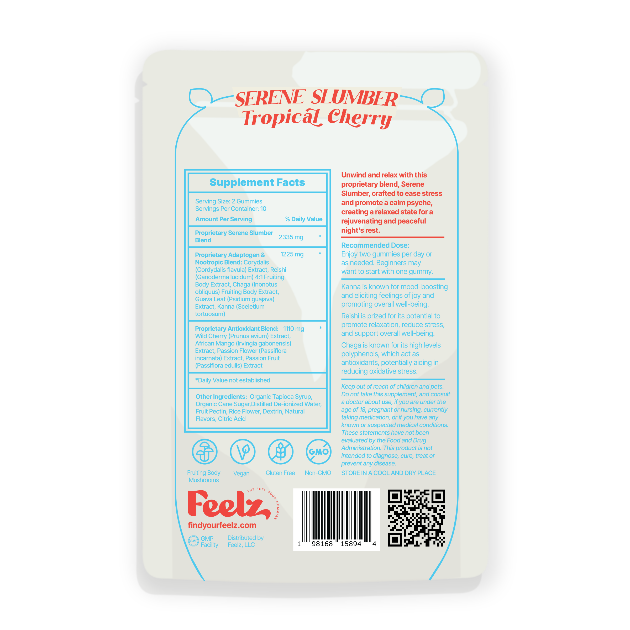 Serene Slumber invites you to kick back and chill with its unique mix made to melt away stress and guide you into a calm, restful sleep. These tasty sleep gummies blend nootropics and adaptogens  - no groggy mornings or buzz, just pure, natural sweet dreams. Packed with calming nootropics, balancing adaptogens, and antioxidants, each gummy supports your nightly wind-down without hemp, CBD, THC, or melatonin. Sleep tight, naturally!