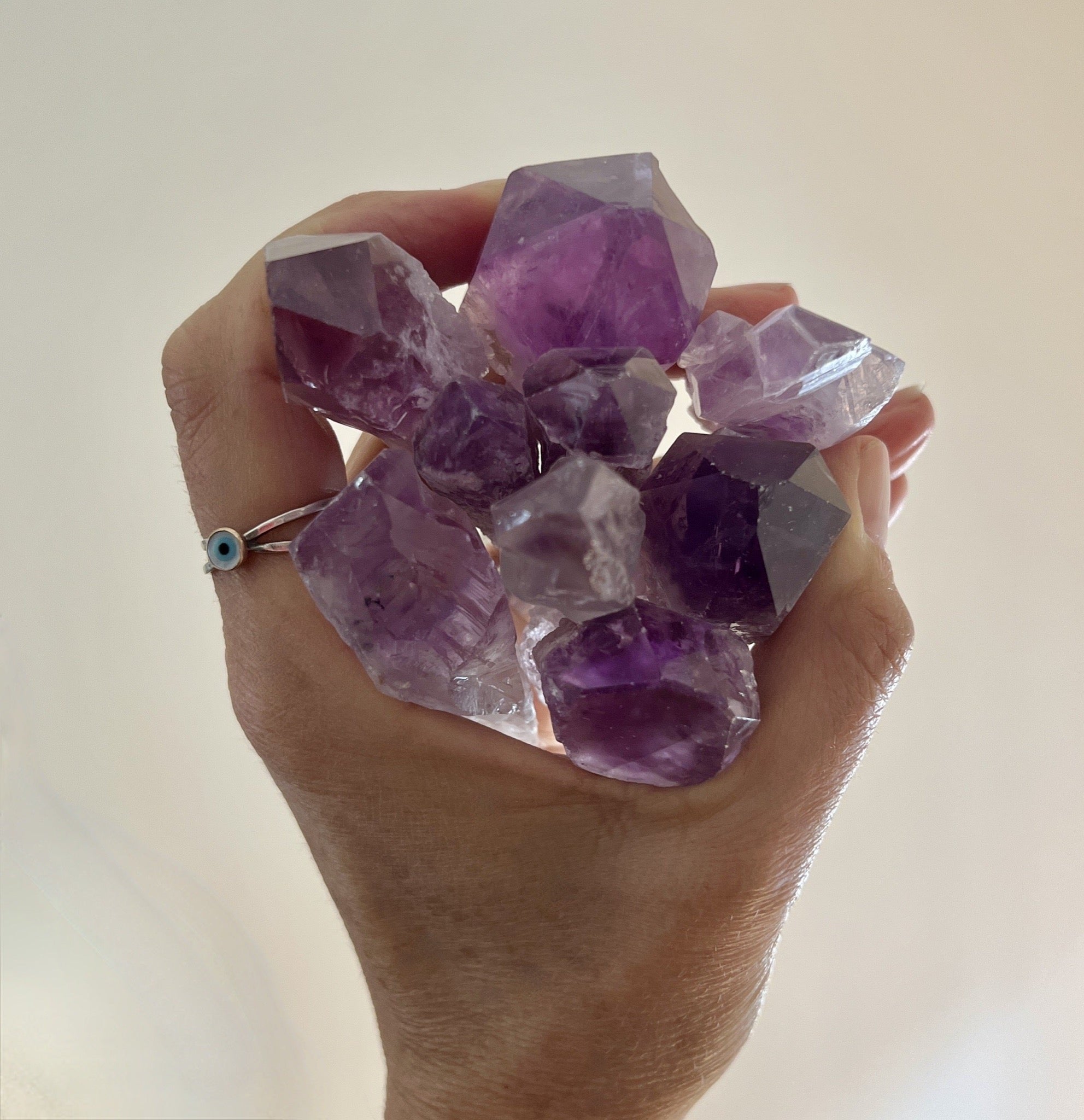 Amethyst is a violet and transparent terminated crystal found in clusters and geodes. Purple amethyst points vary in color from white to light lilac to deep indigo.