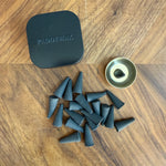 Light up the room with our Teak + Tobacco incense cones - a playful way to transform any space with rich, sophisticated scent. Each tin comes complete with a sleek gold metal holder nestled inside, ready to elevate your ambiance instantly. The charming bellyband wraps around the tin, giving you a sneak peek at the aromatic experience waiting inside. Perfect for creating that just-right vibe whenever inspiration strikes.