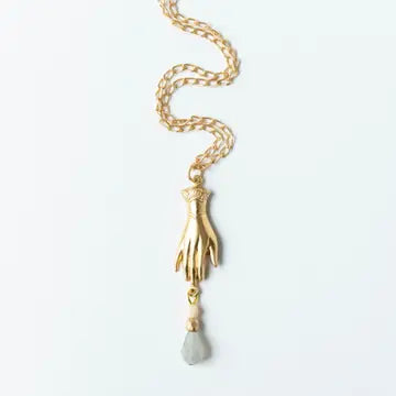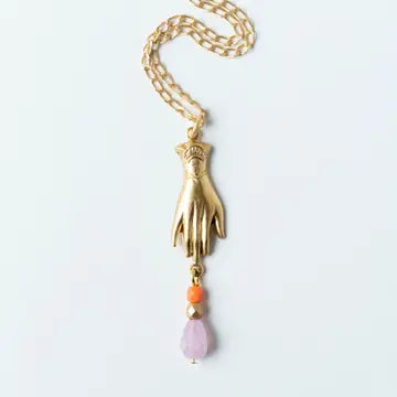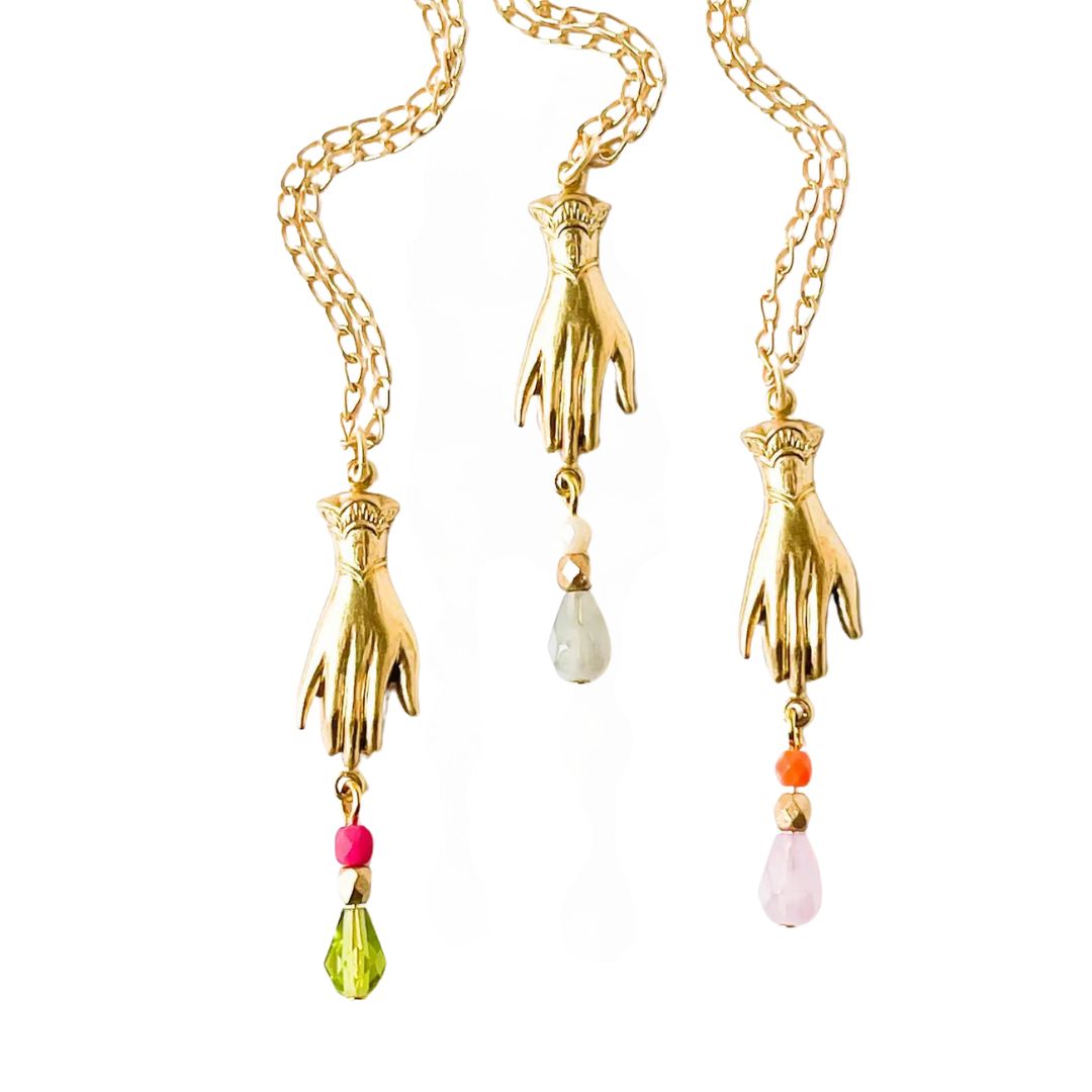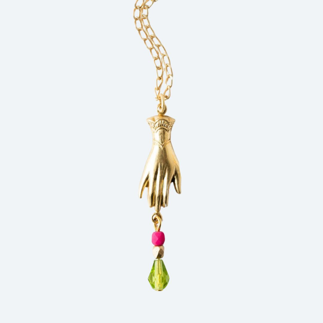 This playful pendant necklace features a brass Victorian hand in a stunning matte gold finish. Plus, it's adorned with three delicate Czech beads, adding a touch of elegance to any outfit. You'll be the talk of the town with this charming necklace!