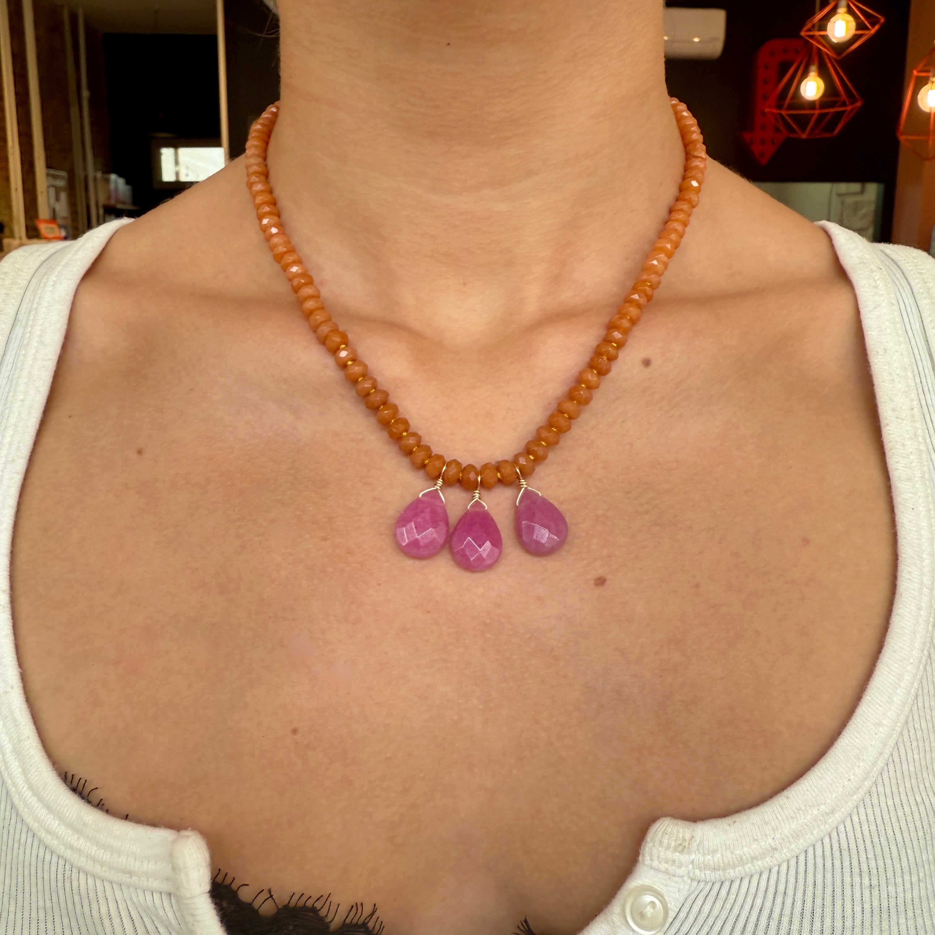 This playful Red Aventurine necklace is handmade with soft silk ties and bright bubblegum pink dyed Jade beads. Its timeless style fits perfectly with any outfit, anytime! Red Aventurine is known to spark leadership, creativity, and courage, giving you the confidence and energy to tackle challenges and chase your dreams. Plus, it’s said to bring good luck and open the door to prosperity while helping you let go of limiting thoughts. A fun and empowering accessory for all seasons!