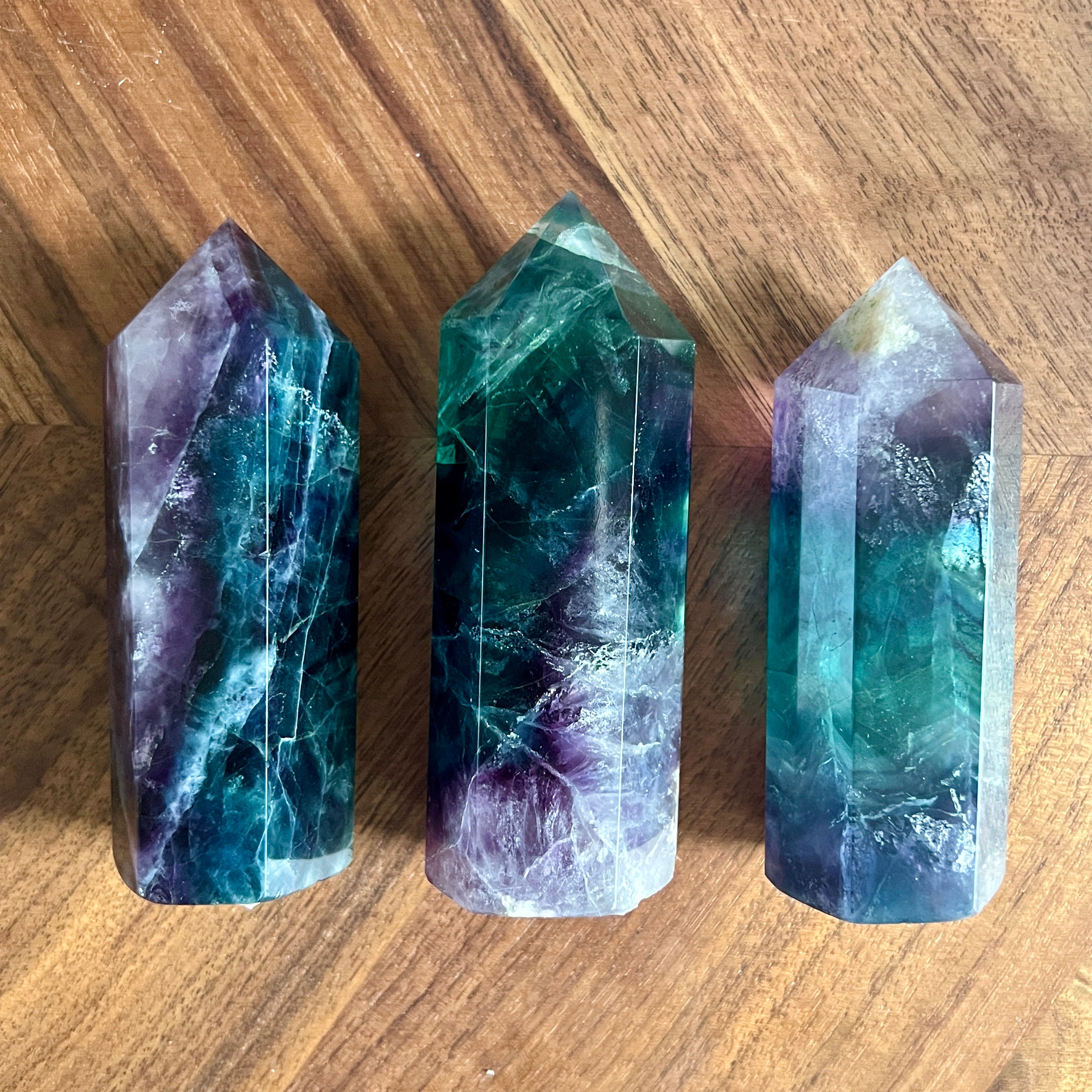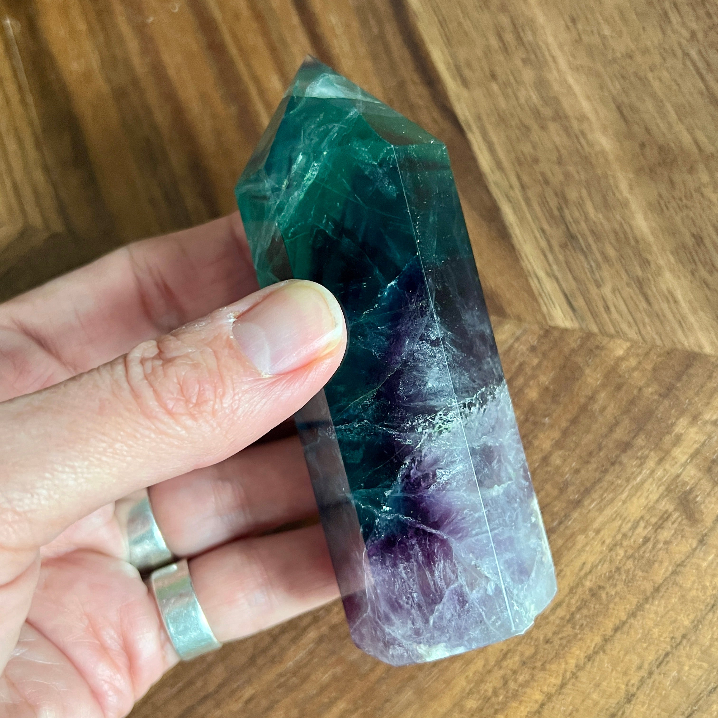 Fluorite is a transparent to translucent crystal containing multiple bands of color from clear to vibrant purple to green. Under ultraviolet light, its display of fluorescence is how this crystal got its name.
