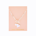 This charming necklace pairs a delicate heart charm with a lustrous pearl accent, all strung on an elegant long link chain with a secure toggle closure. Crafted from fine pewter and finished in your choice of 14 karat gold or silver plating, the Rosie heart necklace brings a touch of romance and sparkle to any outfit. A playful piece that speaks volumes without saying a word.