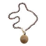 The pearls' color in this Be Magic necklace is notoriously elusive - a blend of burgundy, deep purple and chocolate - all tied together with brown silk. Absolutely stunning! The "be magic" pendant can be taken off and is individually hand-stamped, making each necklace one-of-a-kind! With its versatility, you can wear the single strand with the clasp at the back or to the side, or add on any additional charms you might have!